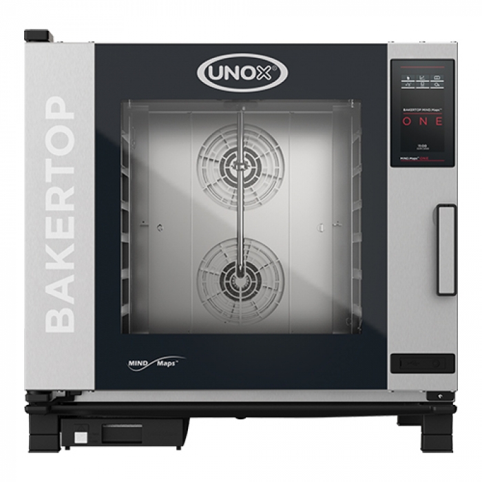 the UNOX Mind.Maps ONE distinguishes itself by the beautiful design and the ease of use of the 7 inch resistive control display, with which dishes can be prepared manually or using the revolutionary Mind.Maps technology, but it also gives access to a list of cooking cycles that have been previously saved or new recipes can be created and saved. The Dry.Maxi technology ensures ideal humidity, Steam.Maxi for perfect steaming, Air.Maxi for perfect hot air circulation and the Rotor.Klean automatic cleaning system ensures a clean oven space