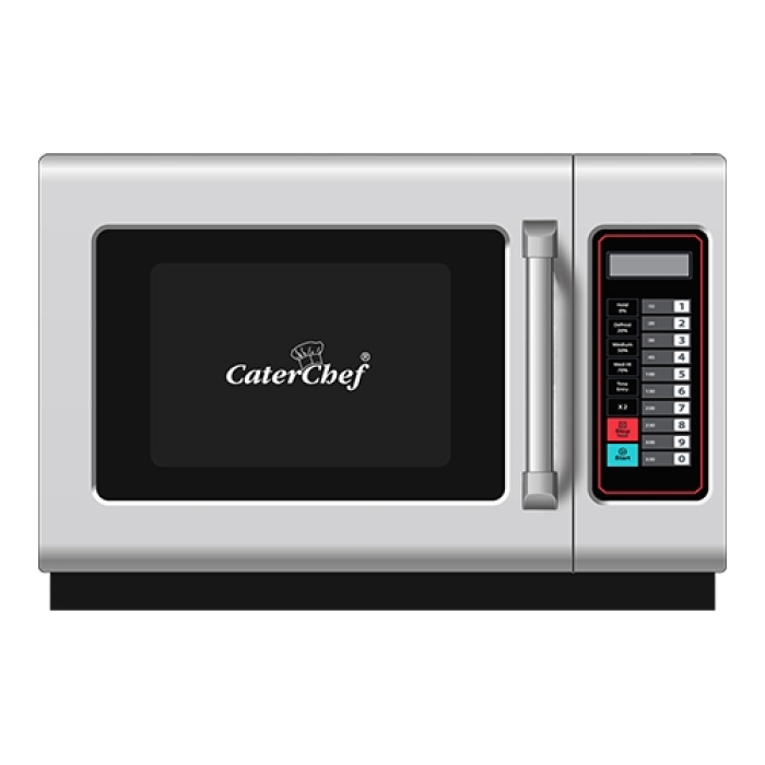 the microwave features a simple digital control panel, 100 adjustable cooking programs (up to 3 stages), and 4 power selection buttons, including a defrost setting. It also includes a quick button to extend the cooking time. The microwave is equipped with a ceramic base and a removable intermediate tray