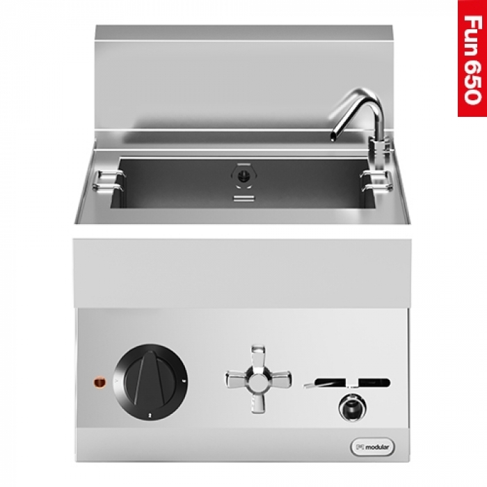 le cuiseur à pâtes est équipé d'un robinet de remplissage, d'un thermostat à 4 positions, d'un voyant et d'un robinet de vidange intégré. Equipé d'une grille perforée au fond du puits sous laquelle les éléments sont encastrés afin qu'il y ait un transfert de chaleur maximal. Les paniers en option sont à mailles fines de sorte que, par exemple, le riz peut également être cuit avec eux