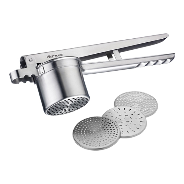 la presse-purée est fournie avec 4 disques interchangeables pour, entre autres, la purée, les spätzle, la crème glacée spaghetti et bien plus encore. La poignée crantée et le support pour casserole assurent une position stable sur la casserole et une prise en main ferme. L’acier inoxydable de haute qualité se nettoie facilement au lave-vaisselle après utilisation