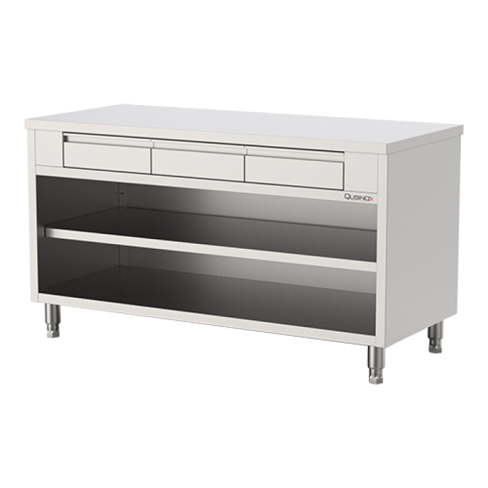 table de préparation en inox, durable et hygiénique. Équipée de 3 tiroirs et d'un soubassement ouvert avec étagère intermédiaire fixe, idéale pour une utilisation quotidienne intensive. Finition brossée et polie avec pieds réglables en hauteur. Le plan de travail est renforcé avec un adhésif imperméable