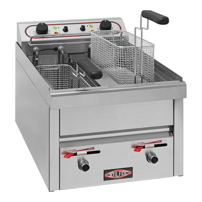 geheel uit roestvrijstaal vervaardigde friteuse met 2 compartimenten, uitgevoerd met zeer krachtige elementen welke zorgen voor een extra hoge afbak capaciteit, model is o.a. uitgevoerd met een thermostaat, koude zone en aftapkraan