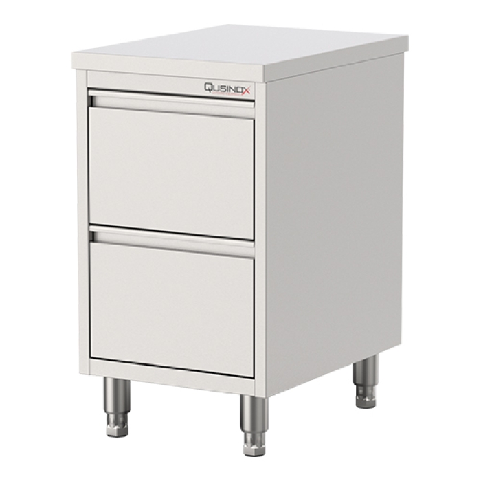 RVS werktafel, duurzaam en hygiënisch. Uitgerust met soepel glijdende laden GN1/1, ideaal voor intensief dagelijks gebruik. Voorzien van een geborstelde en gepolijste afwerking en in hoogte verstelbare poten. Het werkblad is versterkt met watervaste onderlijming